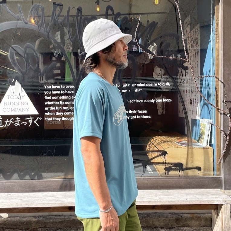 リサイクルポリエステルを採用しており、まるでコットンのような風合いながらも、吸水速乾性が高く、アウトドアシーンでしっかり活躍するTシャツです。
