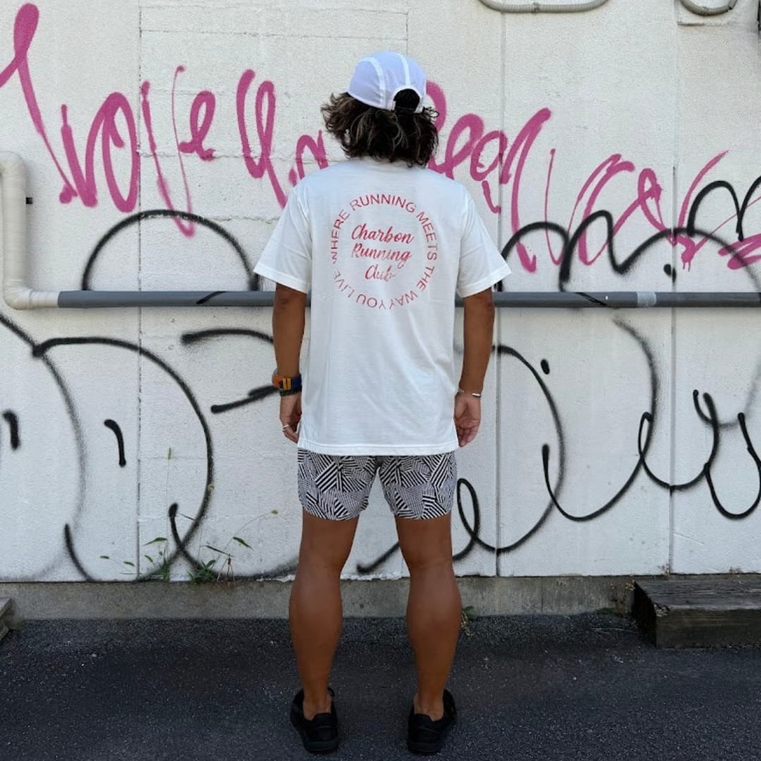 CHARBON RUNNING CLUBが掲げるメッセージ「where running meets the way you live(ランニングとライフスタイルが出会う場所)」をプリント。 生地感と吸汗速乾のバランスが良い、コットンとポリエステルの混紡素材を使用。 ピグメント加工と掠れプリントで、古着風に仕上げました。