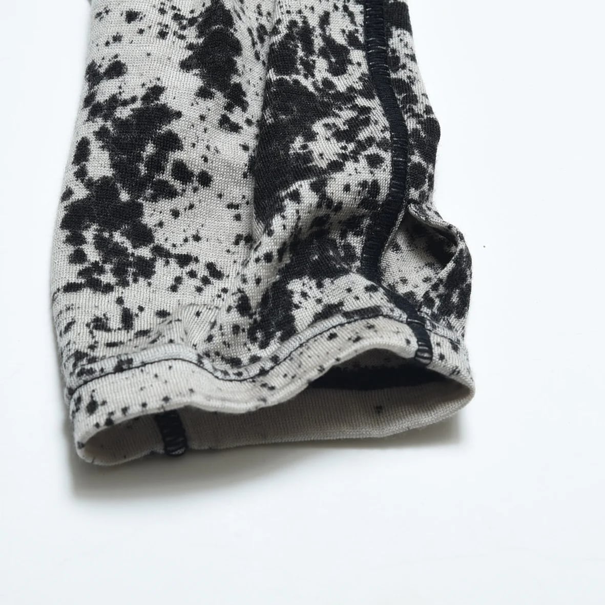 ひとつひとつ職人の手作業で跳ね染め加工(スプラッシュダイ)を施したウールフーディーは、立体的なハイネックやレイヤードを計算した着丈のバランス、サムホール付きの長めの袖丈など、細部にこだわりが詰まったシルエットにも注目。