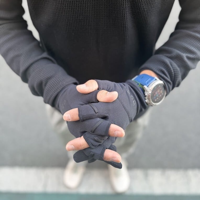 スマホ操作やエネルギージェルの開封、ウエストコードや靴紐を結ぶ際に必要な3本指の第一関節がオープンになっているので、グローブをしたままでも細かい操作が可能です。
