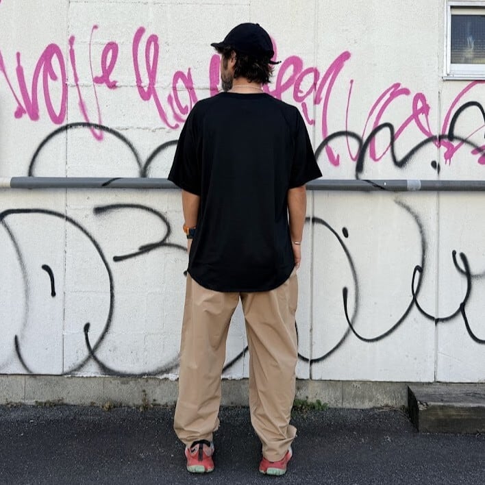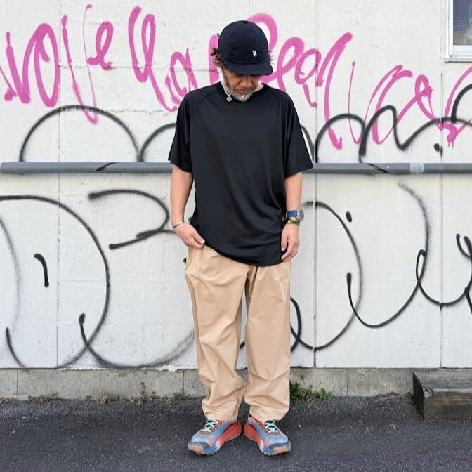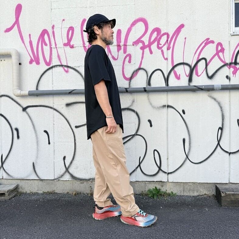 ゆったりとしたシルエットと、フロント部分に2プリーツ入りで、足上げしやすく、段差も軽々と越えていけそうです。