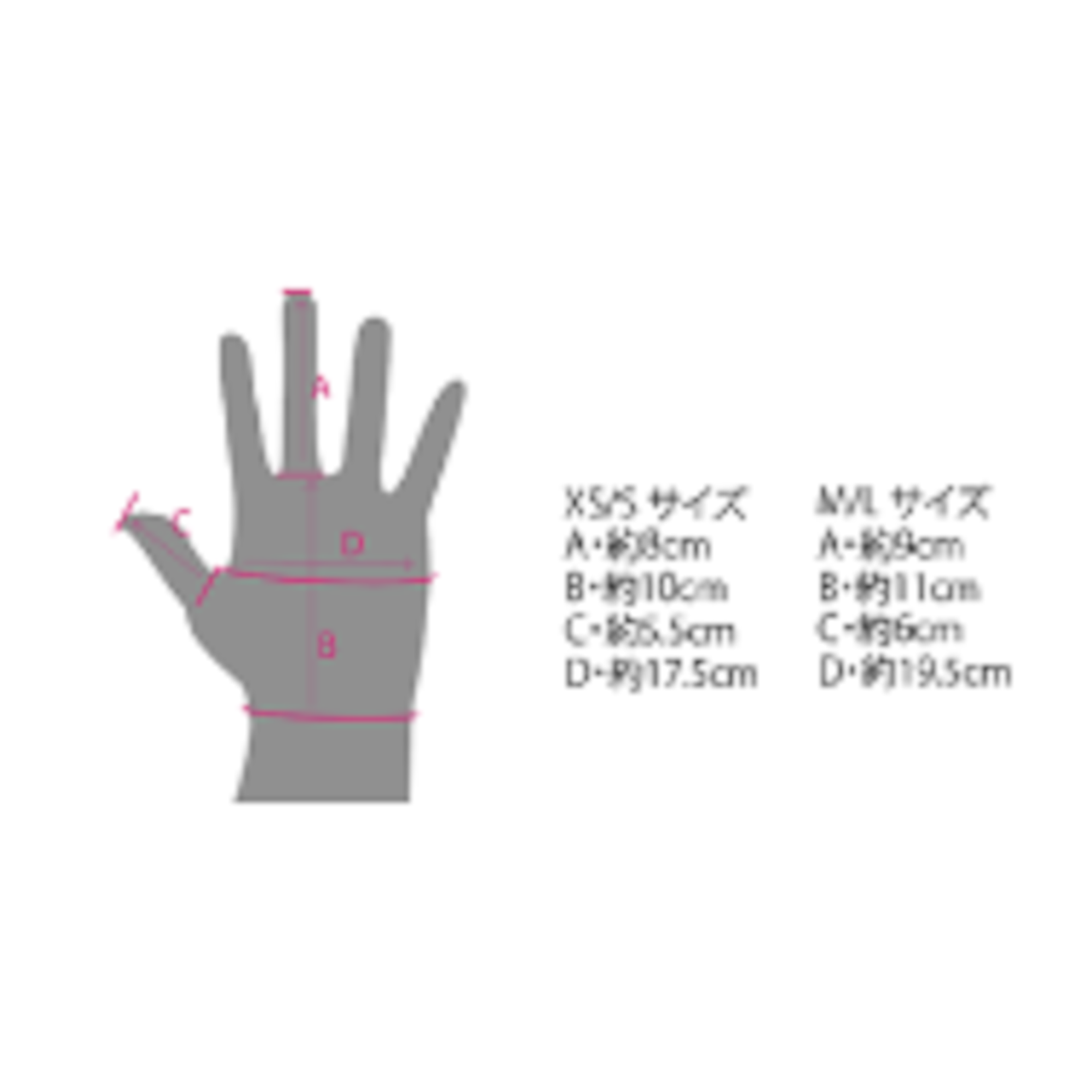 難しい判断だとは思いますのでグローブ自体の中指の付け根からの長さと手の甲の長さ(親指を抜いた手の甲の幅)を掲載しておきますので参考にしてみて下さい。